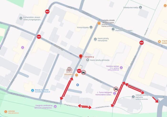 🏨 At the top, you’ll find T. Daugirdas Street and our hotel.
