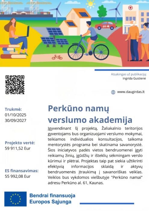 Projekto „Perkūno namų verslumo akademija“ tikslas – skatinti Kauno miesto Žaliakalnio seniūnijos vietos veiklos grupės (VVG) teritorijos gyventojų verslumą ir socialinį aktyvumą, suteikiant jiems reikalingų žinių, įgūdžių bei pagalbą verslo pradžiai. Įgyvendinant projektą bus organizuojami verslumo mokymai, teikiamos konsultacijos ir taikomos mentorystės programos bei skatinama savanorystė, kas padės užtikrinti, kad vietos gyventojai turėtų reikiamas žinias, įgūdžius ir išteklius, reikalingus sėkmingam verslo kūrimui ir plėtrai, taip pat užtikrintų efektyvią informacijos sklaidą ir bendruomenės įtraukimą į savanoriškas iniciatyvas. Veiklos bus orientuotos į nedirbančius, darbingo amžiaus, ekonomiškai neaktyvius asmenis, kurie planuoja pradėti individualią veiklą. Įgyvendinant šį projektą siekiama didinti vietos gyventojų ekonominį aktyvumą, skatinti jų integraciją į darbo rinką ir prisidėti prie bendro Žaliakalnio bendruomenės stiprinimo.